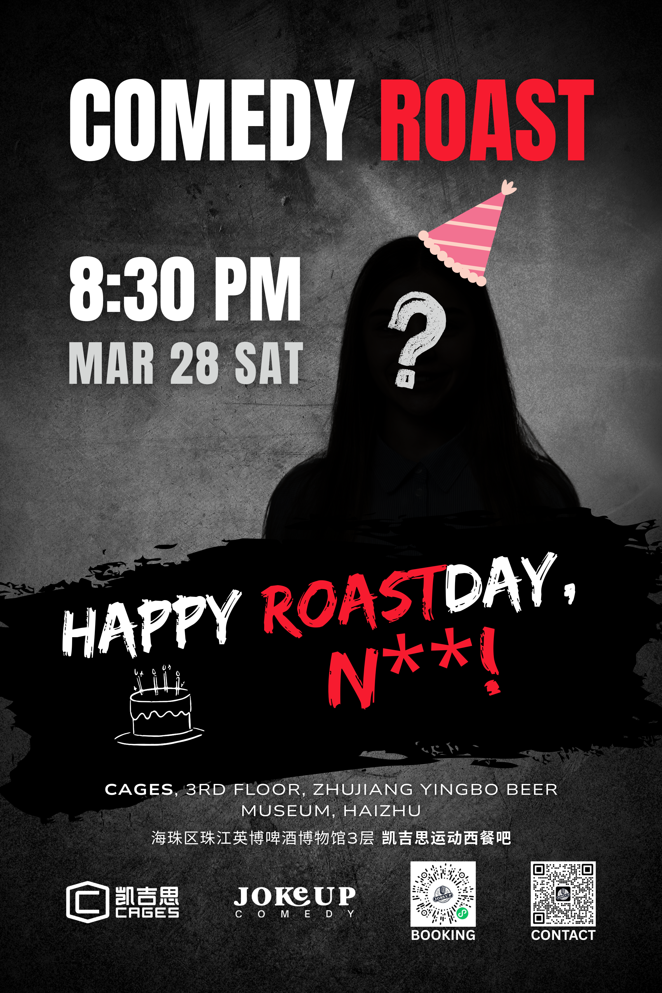 English stand-up comedy night at Cage’s (Guangzhou) — Open Mic + Roast Day edition.